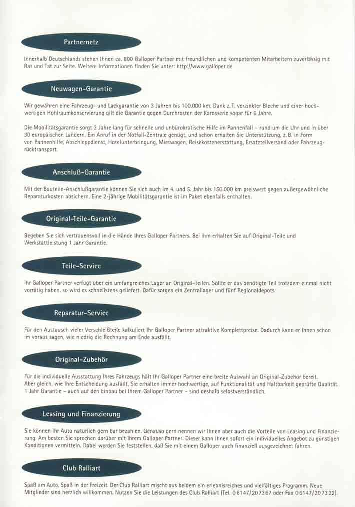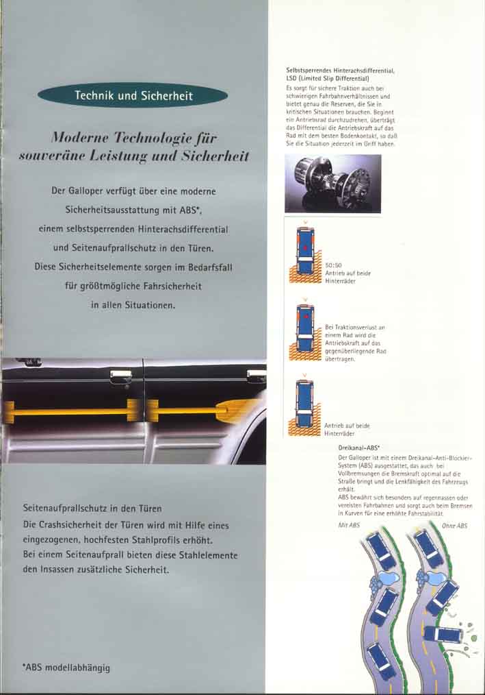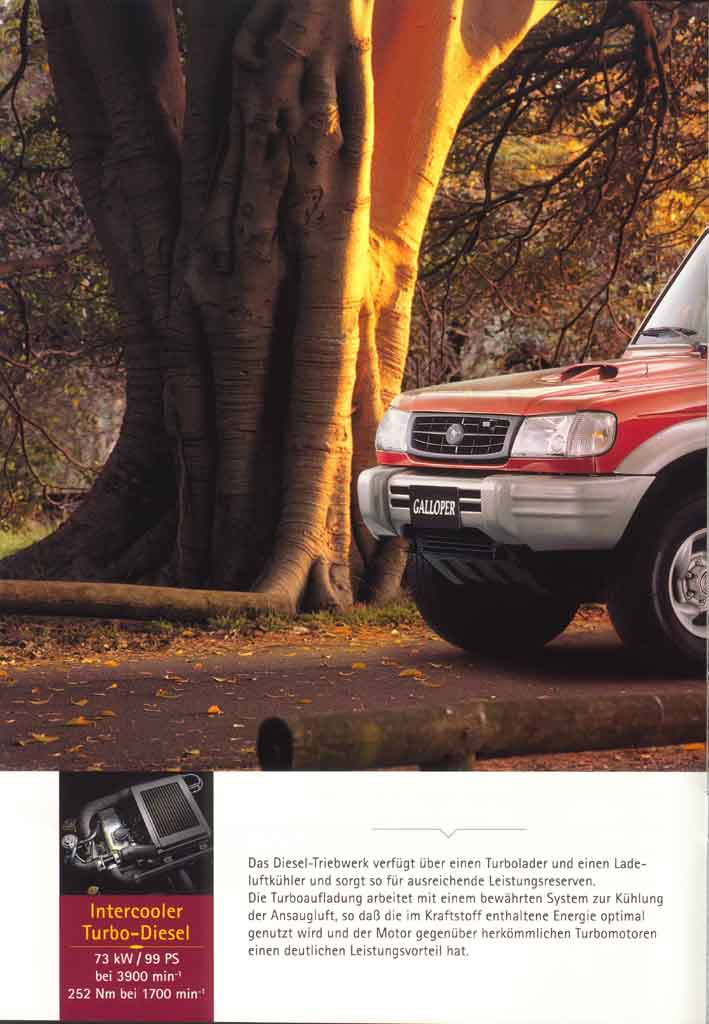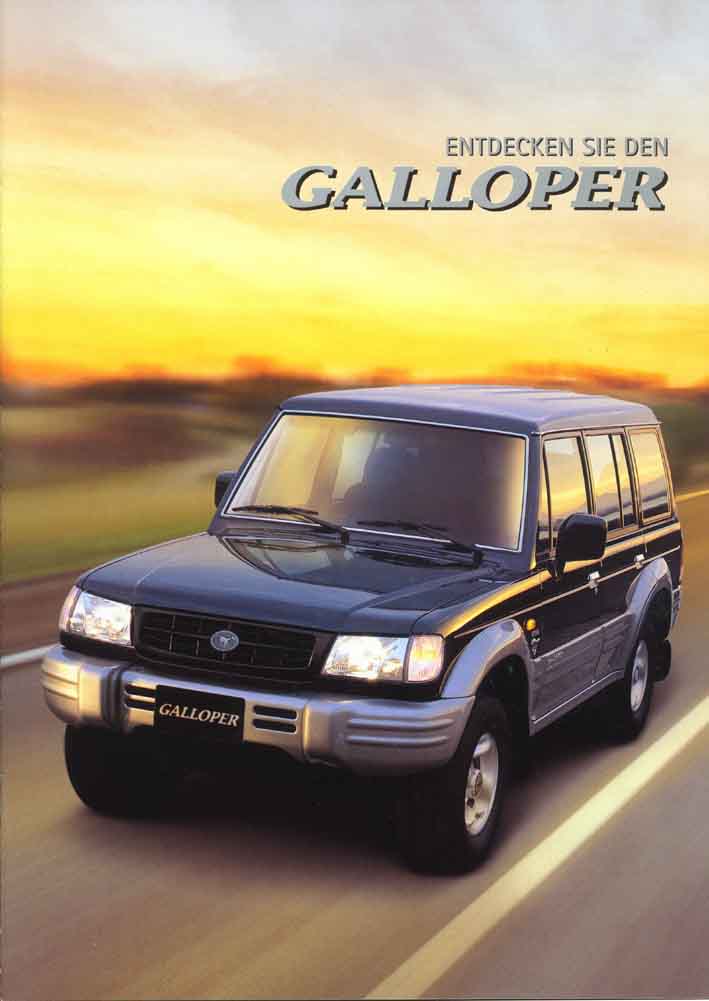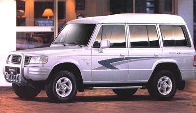 GALLOPER 2.5 TC - (COREA) La version sin intercooler del galloper, la más basica generalmente tiene menos plasticos por afuera que la TCI (con intercooler). Tiene un poco menos de rendimiento (85 cv contra 105 cv) que las versiones TCI, y algo menos de equipamiento interior. De este modelo se puede encontrar la que tiene techo más alto, y capacidad para 10-11 asientos. Esta es la version "de trabajo" del galloper. Además, atras tiene las ventanas "corredizas". Tiene DSL en el eje trasero.