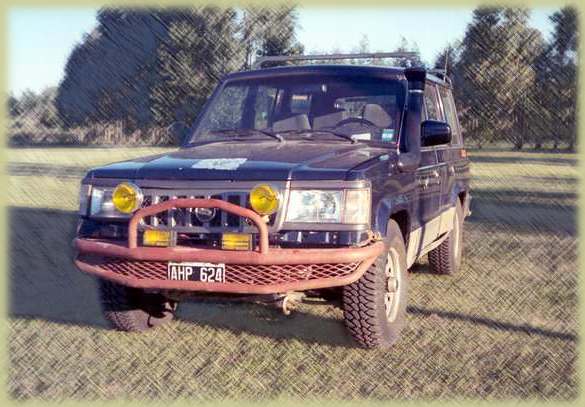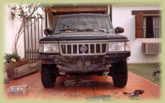 La instalación de estos paragolpes caseros, construidos a base de caño y rejilla, utilizados en lugar de los paragolpes originales de la korando, le dan al vehiculo una clara mejora en cuanto a protección, ángulos de ataque y "estetica" 4x4. Esperemos que en algún momento pinte esos paragolpes (rosas?). Noten tambien que ha cambiado las luces originales anti nieblas (embutidas en el paragolpes original), por unos faros amarillos redondos montados sobre una mini defensa que cubre la parrilla, y otros cuadrados más abajo. Buenisimo, se me estan ocurriendo unas ideas para implementar en el lada...