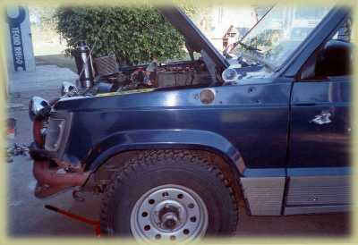 El propio snorkel tapa todos los agujeros que se hacen al guardabarros, y no se ve nada de nada, una vez instalado.7) La decision de entrar en forma directa al compartimiento del motor, nos obligo a retirar el compartimiento del filtro de aire de su soporte; para cambiar la direccion de la entrada de aire. Normalmente la entrada de aire esta en forma transversal, unida a una caja que hace de trampa de agua. Hubo que girar la entrada de aire 45º hacia atras para poder conectar la manguera que iba hasta el snorkel.Esto obligo a desoldar los soportes y volver a soldarlos para darle la orientacion correcta a la entrada de aire del filtro.