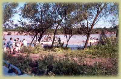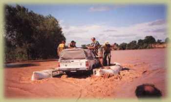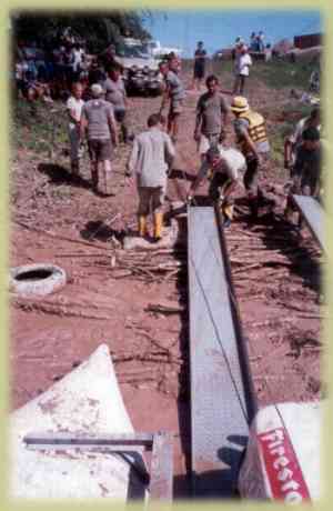 Un grupo a la costa chaqueña, para el armado del pontón que cruzaría las camionetas, el otro para mejorar un poco el embarcadero que con solo el paso de una camioneta ya estaba muy deteriorado. Luego de una hora y media ya con el pontón armado, empezó el cruce, fue realmente un parto, hasta que luego de la gran tensión llegó la camioneta a la costa chaqueña, bastante barro también para desembarcar, muy duro laburo y a eso de las 19.00hs, alrededor de 12 hs continuadas, la locura de cruzar 13 camionetas ya estaba concluida, buen baño, asadito para distenderse y a descansar. La Selva Impenetrable nos esperaba.