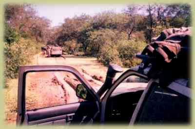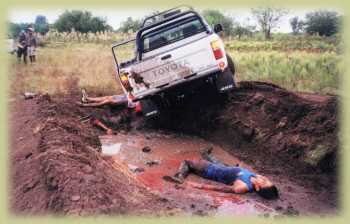 Superado el Río Bermejo, como un trofeo de guerra, entramos en caminos y senderos con mucho barro y agua, primer día en el Impenetrable chaqueño fue bastante duro y largo, el primer grupo que llegó a descansar en Las Hacheras fue el nuestro , eran ya las 00.30hs., pasos de barro muy bravo, la única técnica que nos dio resultado fue con cinco personas de cada lado aguantando de a una las camionetas para no caer en una parte demasiado profunda donde ya había caído la primera en pasar y llevó mucho tiempo poder rescatarla, a partir de allí nos encontramos con muchos senderos que complicaron poder encontrar el camino principal, literalmente llegamos a perdernos.