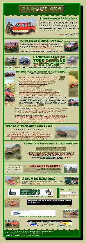 Somos un sitio web dedicado al mundo del todo terreno. Brindamos y recibimos información sobre conducción, seguridad, accesorios y equipamiento, y todo lo relacionado con el off road. Nuestros lectores y suscriptores comparten nuestro estilo: Artículos concisos que informan sobre técnicas de uso del 4x4, sus reparaciones y mejoras mecánicas o sus accesorios. más de 200 de publicación, y sin publicidad masiva, tenemos un promedio de 200 visitas por dia, quienes nos acercan sus impresiones y experiencias, su interés por realizar travesías, sus inquietudes sobre compra de equipamiento... y sus felicitaciones por nuestro emprendimiento. En este marco queremos hacerle llegar una propuesta: Sea parte de Parque4x4.